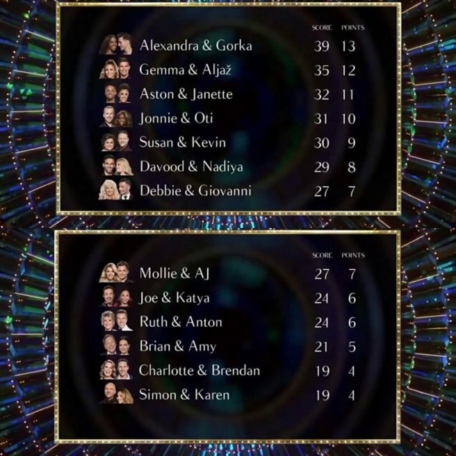 Just behind them on 35 points were Gemma and Aljaz with their well received Paso Doble, with Aston and Janette completing the top 3 with 32 for their quickstep. Down at the bottom end of the leaderboard, both Charlotte and Brendan and Simon and Karen both scored 19 a piece for their Jive and Samba respectively.