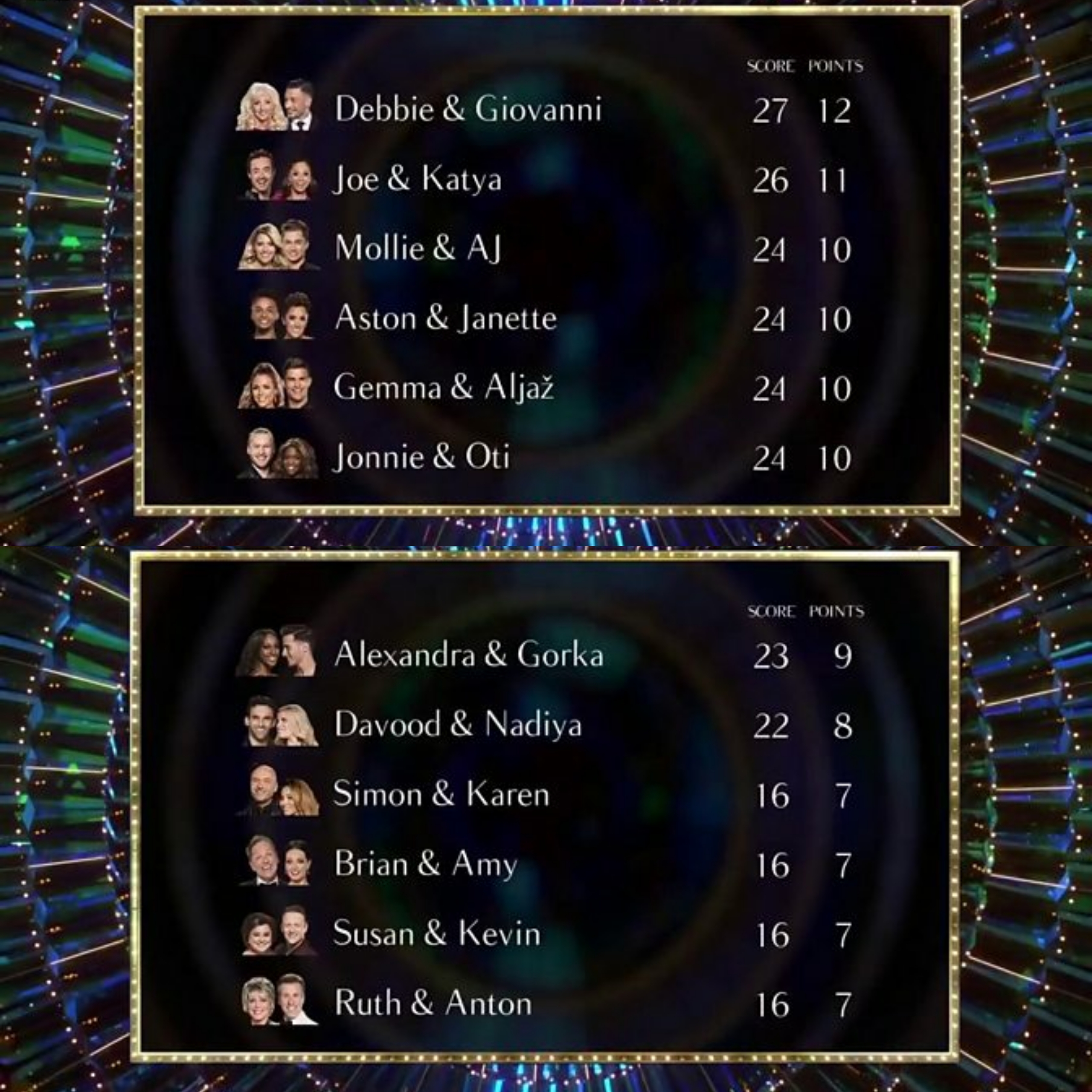 We saw a return to the top of the leaderboard for Debbie and Giovanni, who scored a maximum of 27 out of 30 for their beautiful Rumba. Elsewhere, Joe and Katya finished just behind them on 26 points – 10 of which were awarded by Shirley – for their traditional and well received Paso Doble.