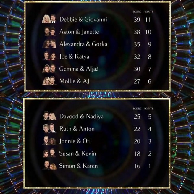 Down at the bottom though, dance off survivors Simon and Karen found themselves in last place again with only 16 points for their American Smooth.