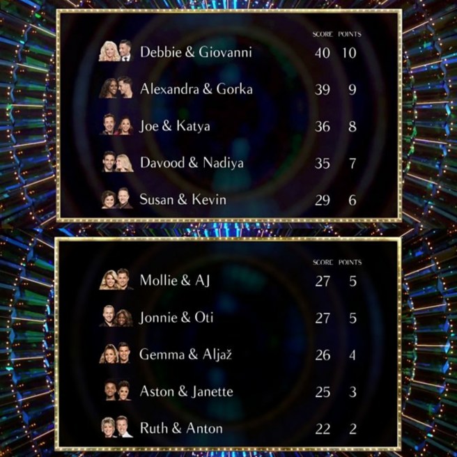 Sorry for the late start guys! So last night, the ten remaining couples danced again on the seventh live show. And Debbie and Giovanni came top of the leaderboard for the second week running as they scored a perfect 40 for their Tango.