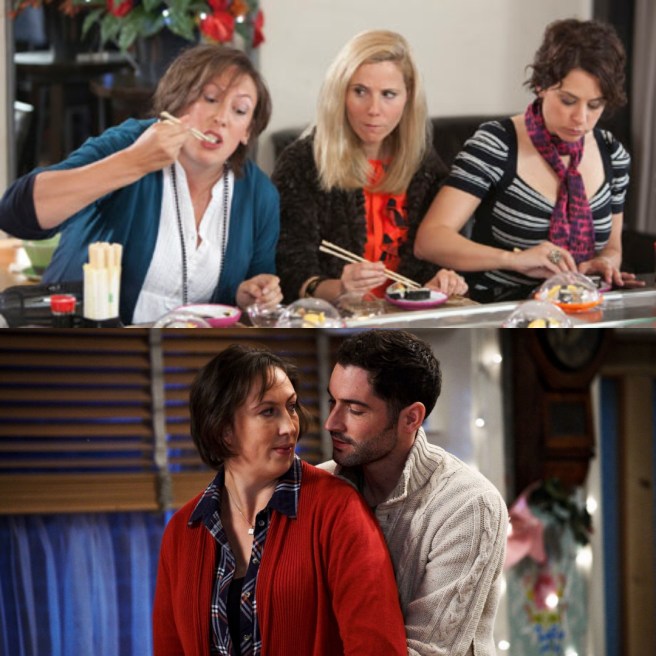 Tilly is getting married to army doctor Rupert (‘Oh please, call me the Bear – GRRR!’), who immediately starts hitting on Miranda, as indeed does crisp loving ‘Dreamboat’ Charlie (recurring guest star Adrian Scarborough), as Penny pursues another relentless round of match making against Miranda’s will before Tilly’s big day. And into the mix of all this, she goes on her first proper date with Gary after an intervention from Stevie and catty restaurant owner Clive (James Holmes) – but their attempts to get *mouths quietly* sexual end in disaster…