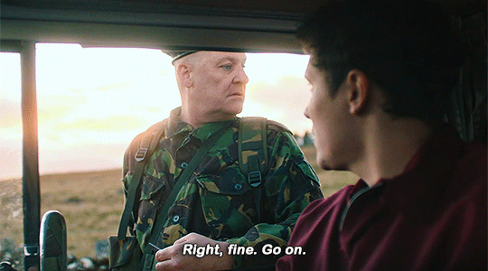 The Our Lady Immaculate College camper van loaded up to the gunnels with booze and supplies, the gang get to the checkpoint at the border to Donegal. When they clock that James is English, Michelle has to reassure the soldiers that they’re not taking him over the border to torture him. In fact, Orla helpfully explains why they’re there a bit more…