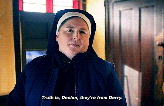 The gang (but mostly Erin) give their condolences, before asking if there’s anything they can do to help at this difficult time (not too subtly in Michelle’s case, for which it will become apparent later on). Sister Michael then tells them that her Aunt’s house in Donegal will indeed need clearing out.